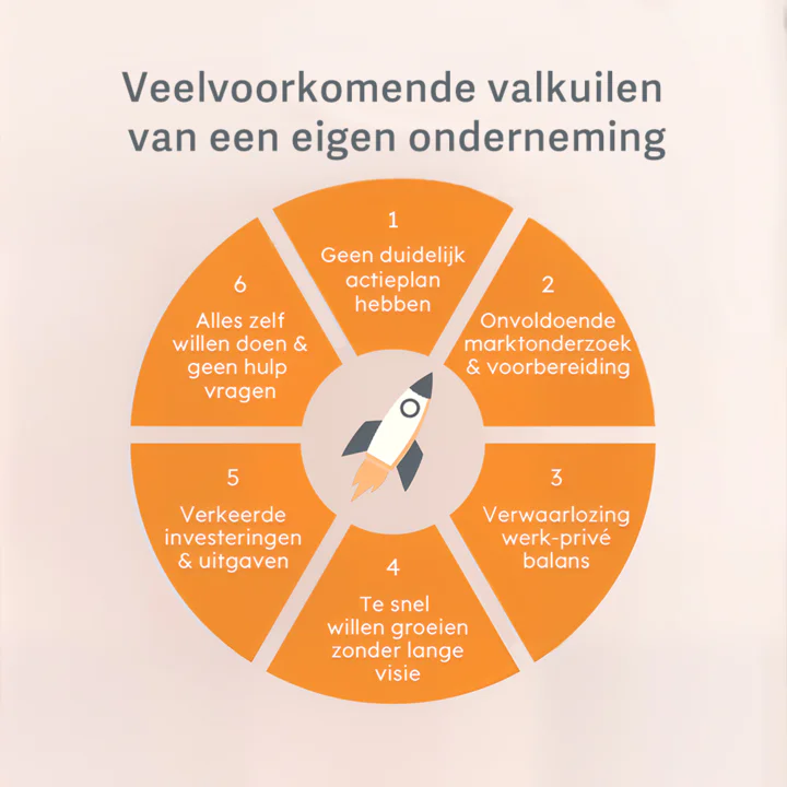Ondernemen leer je door te doen, maar het gaat veel makkelijker als je weet waar je op moet letten. Let daarom op de veelvoorkomende valkuilen in de afbeelding.
